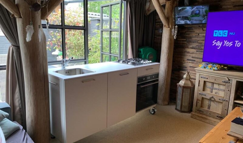 Het mobiele keukenblok is recent door een klant gehuurd omdat hun keuken verbouwd werd. De klant had een prachtige overkapping waar onze mobiele keuken perfect tussen de houten staanders paste, alsof hij er voor gemaakt was.